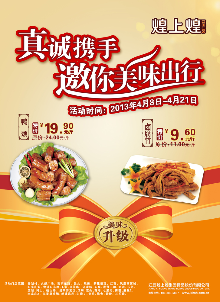 活動內容:鴨脖特價19.9元/斤(原價24元/斤),鹵腐竹特價9.6元/斤(原價11元/斤)